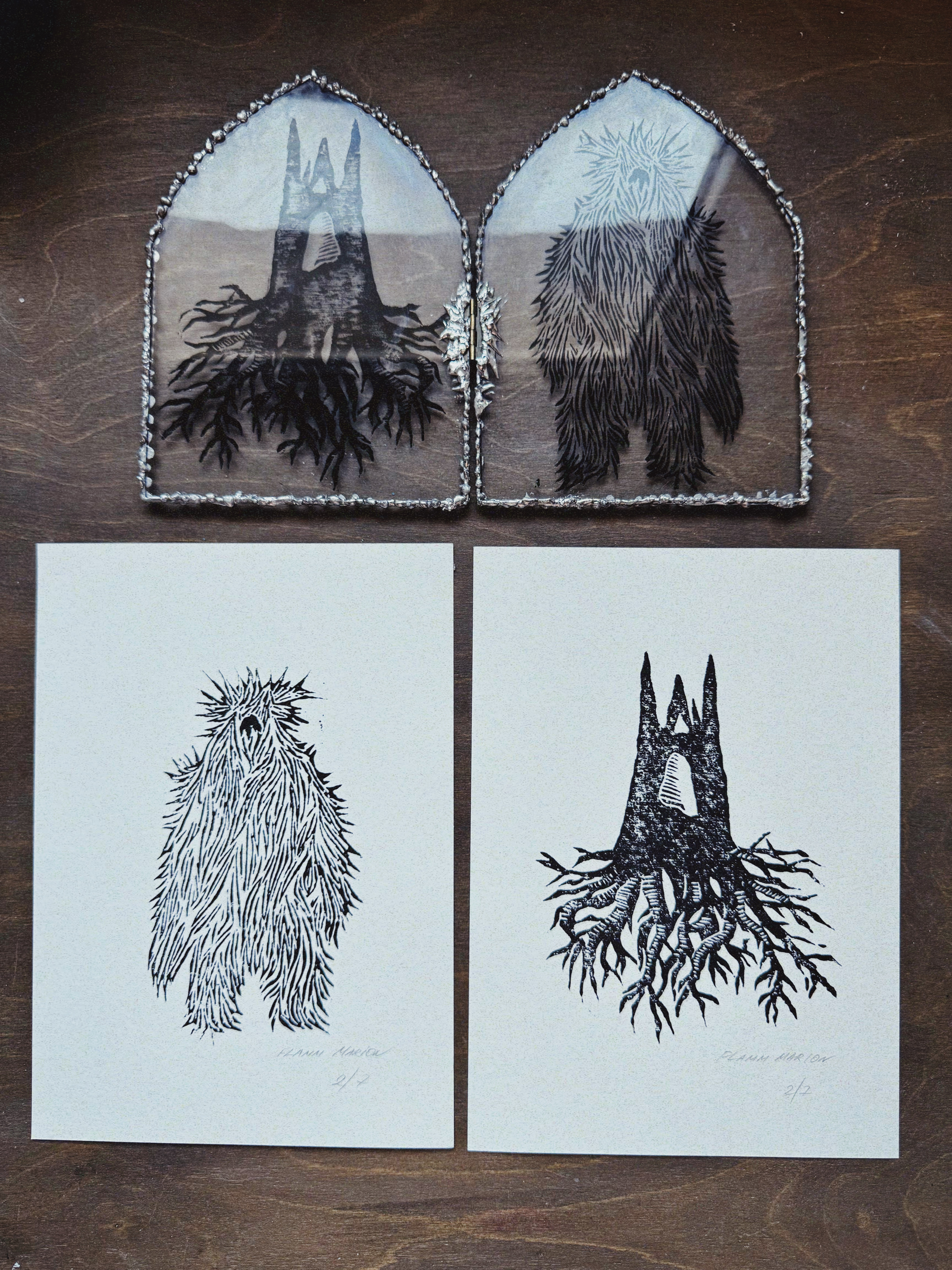 Я работаю в разных техниках: линогравюра, выжигание по дереву, витраж, коллаж. Каждая серия работ тесно связана и дополняет друг друга. Поэтому я работаю одновременно над несколькими сериями. Мой метод - сначала я изучаю себя, как та или иная тема повлияла на меня, ищу истоки в детстве, юности.