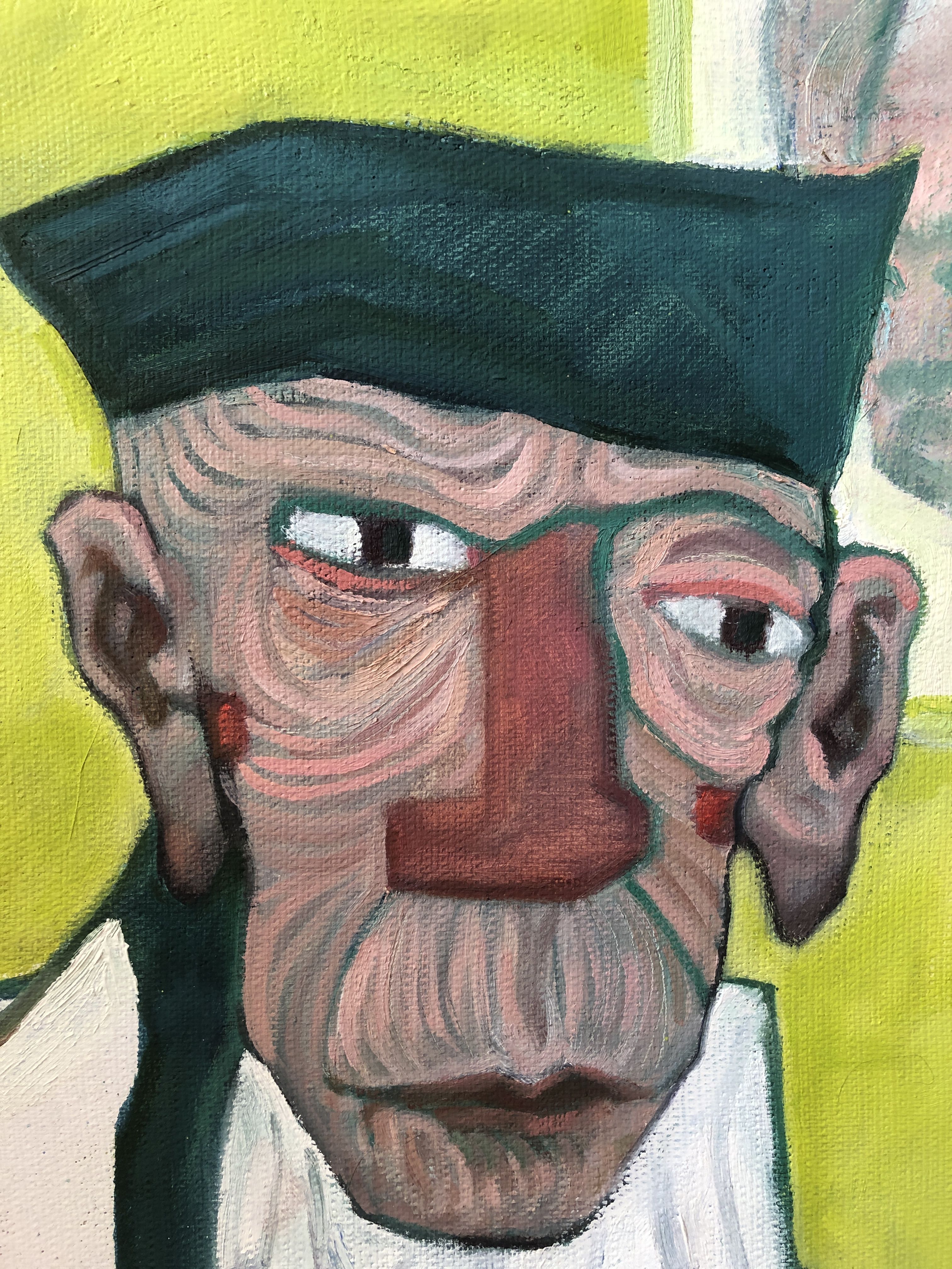 Шуточный условный портрет. Яркий, даже «вырвиглазный» фон контрастирует с графичными чертами лица пожилого кавалера.